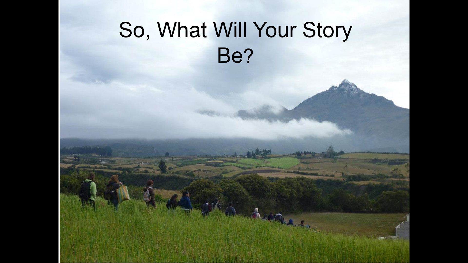 “Today we’re going to talk about this question,” I say to the students, gesticulating behind me. “What will your story be? And what I’m talking about here is your life story. In five years when you’ve graduated from (insert high school name) and return, what to do you want to tell people you’ve been doing? Or in fifty years, when you have kids and grandkids, what kind of experiences do you want to have had that you can share with them?”