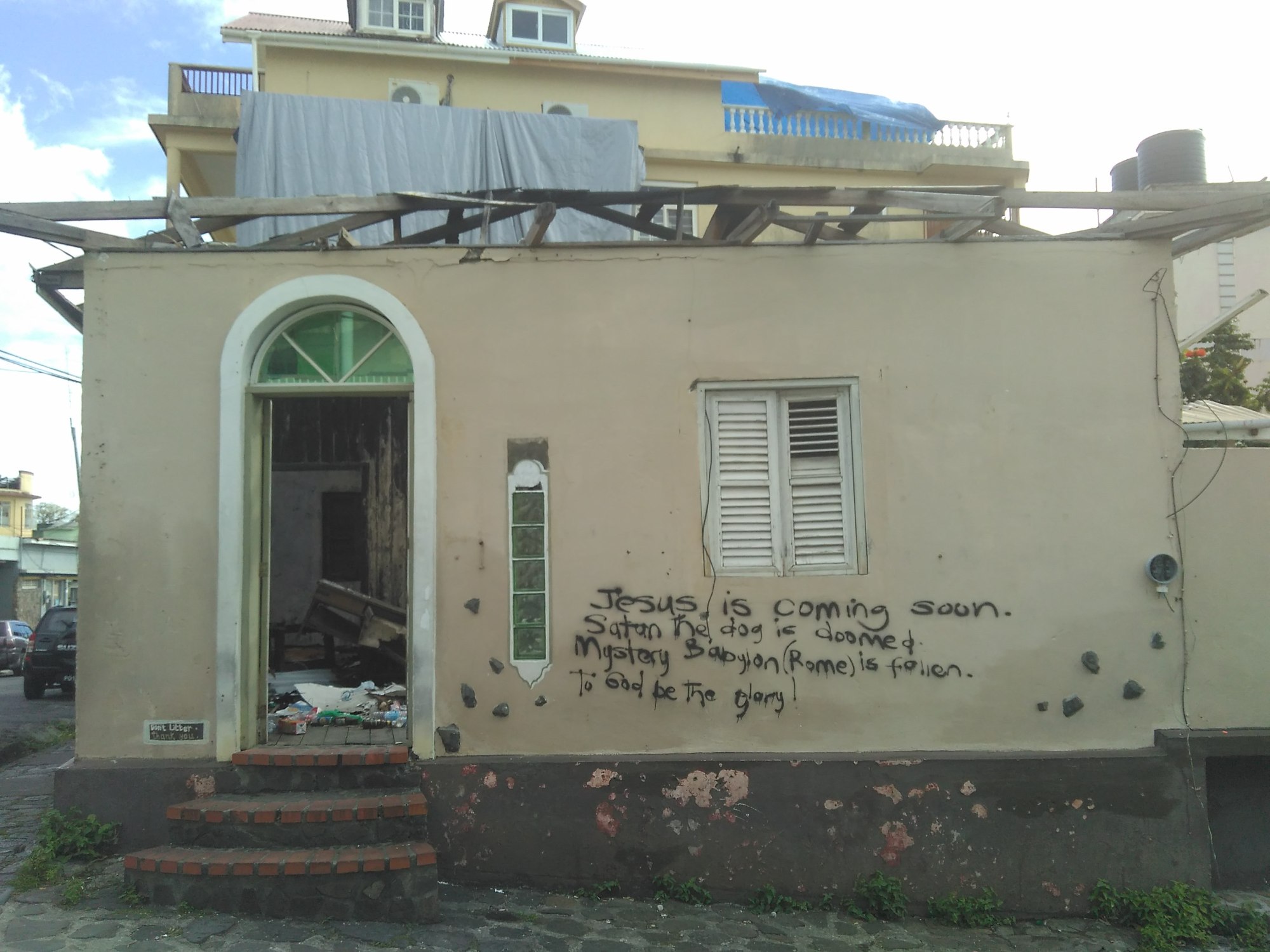 In the days following the disaster, neighboring countries and humanitarian organizations rushed to Dominica to respond. Coordination was as swift as possible to bring in food baskets and tarpaulin and water systems. The government imposed a curfew and rations on bread, sugar, and milk. Desperate looters raided supermarkets and stores. Seven months later, 80% of Dominica still doesn’t have power. 400 people are still living in emergency shelters. While the roads have been cleared, the destruction is still apparent. Tree trunks the size of cars lie scattered in fields. Concrete retaining walls crumble into the street. Downed power lines are everywhere: snaking across the pavement and into gutters. Looking out from the parish in the waning light, most of buildings still don’t have proper roofs. 90% of buildings in the country were damaged, and the sounds of hammering and chainsaws float across the city, a constant symphony of reconstruction.